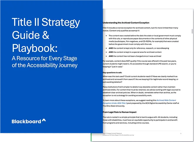 With Ally, instructors can quickly and easily deliver accessible and inclusive digital content that’s personalized to each learner's needs, challenges, and preferences—saving time and helping everyone succeed while also helping meet Title II requirements.