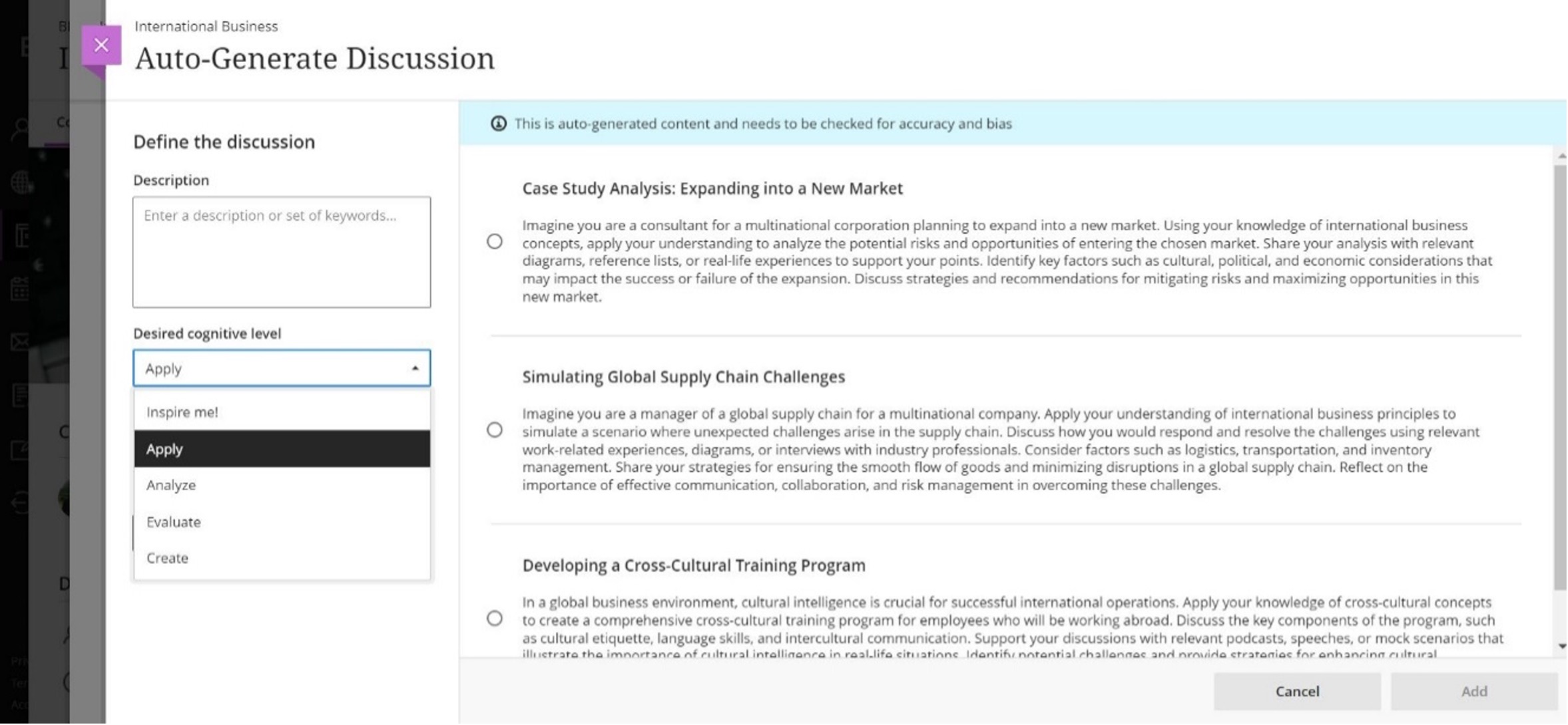 With both of the above initiatives resonating with our global community, our next course of action was clear: expand the functionality of the AI Design Assistant to inspire instructors to create authentic assessment tasks. And that’s just what we’ve done: as of the December release, all Blackboard Learn Ultra clients can now generate authentic assessment prompts for discussions and journals as part of their standard license, with assignments to follow soon.